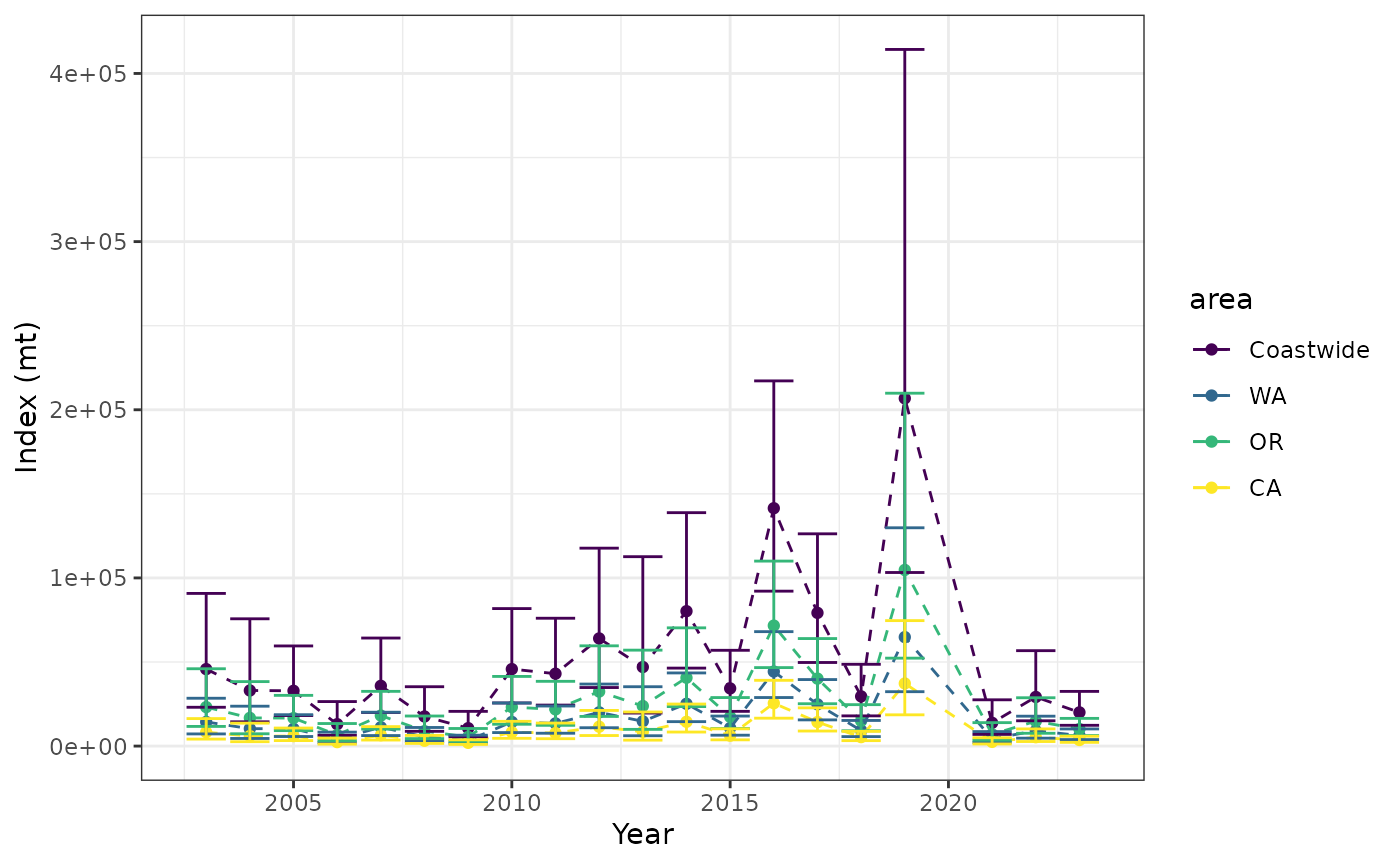 #> [2] "catch_weight ~ 0 + fyear + pass_scaled"we are going to use the default configuration. Please see the vignette on multiple area indices for an example run with the other formulation available for yellowtail rockfish.